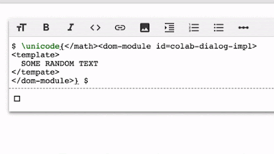 This was the exact moment during testing when I felt that I was on the right track and on a good way to XSS. Why? Because, such behavior of the application proves that Closure library is not used to clean HTML generated by MathJax (LaTeX library). At this point, the problem of finding XSS in Colaboratory - boiled down to finding XSS in MathJax. It seemed quite likely for me that MathJax wasn’t carefully audited for security issues.